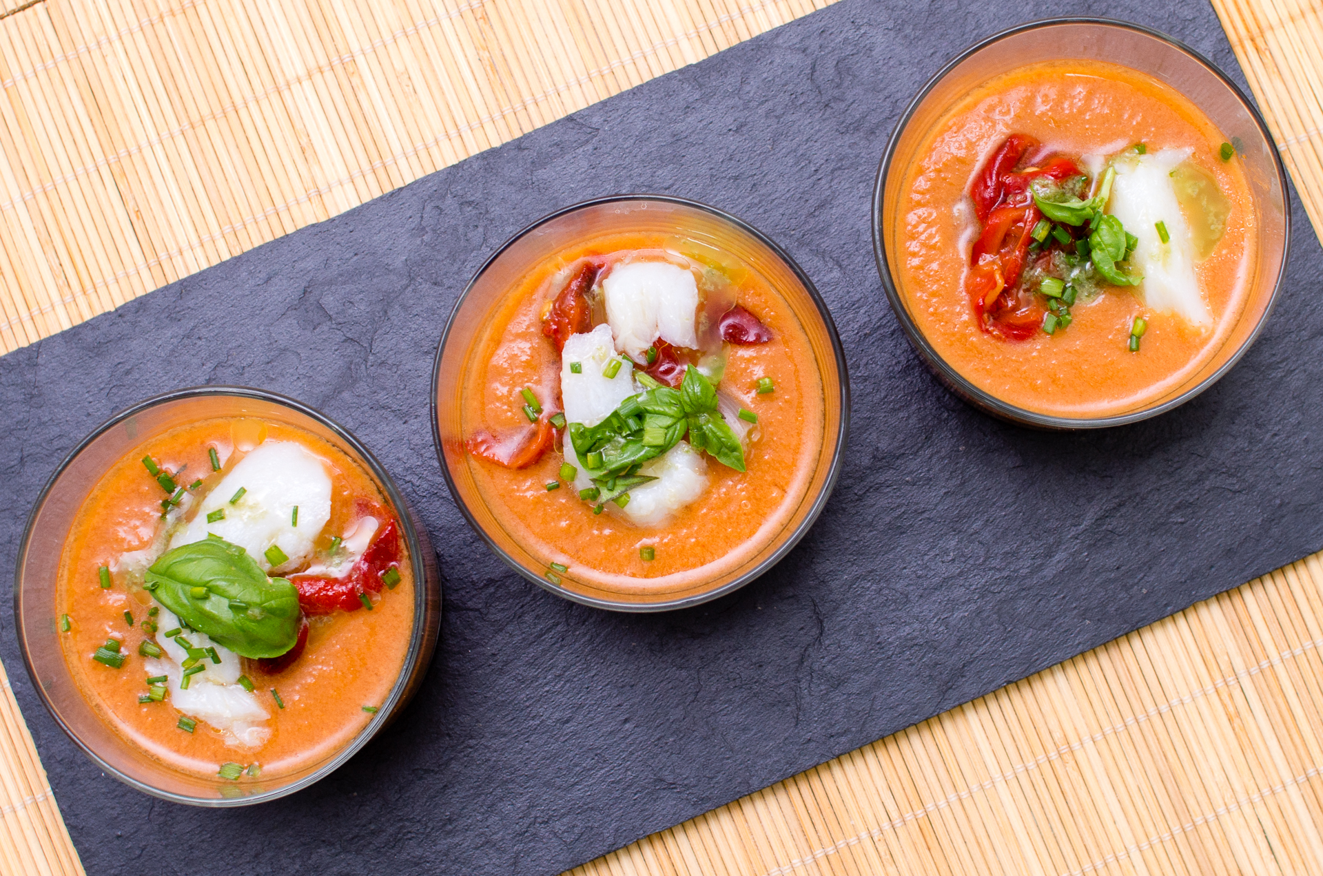 La crema fría de escalivada y fresas con guarnición de bacalao confitado y aceite de albahaca es una receta ideal para cuando tienes invitados en casa o para llevar a una cena de amigos o familia. Seguro que va a llamar la atención y todos van a creer que has estado horas en la cocina. Pero, como verás en la receta, tu Thermomix y tu horno, hacen casi todo el trabajo. Y, el sabor, es sorprendente.