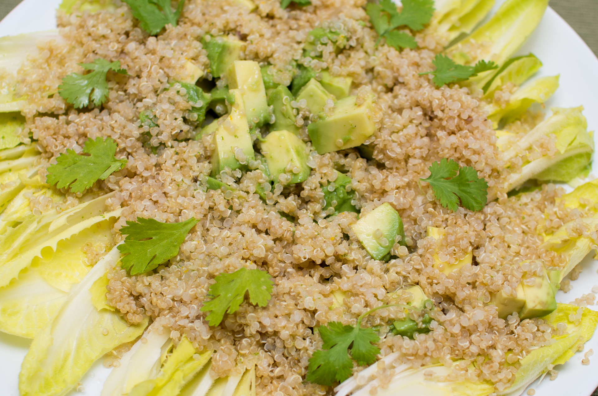 - Cuando esté fría la quinoa, vuélcala sobre las endivias y acompaña con el aguacate cortado en tacos pequeños para que quede bien repartido en toda la ensalada y, en el momento de servir riega todo con el aliño que tienes reservado. Decora con el cilantro o perejil picados.