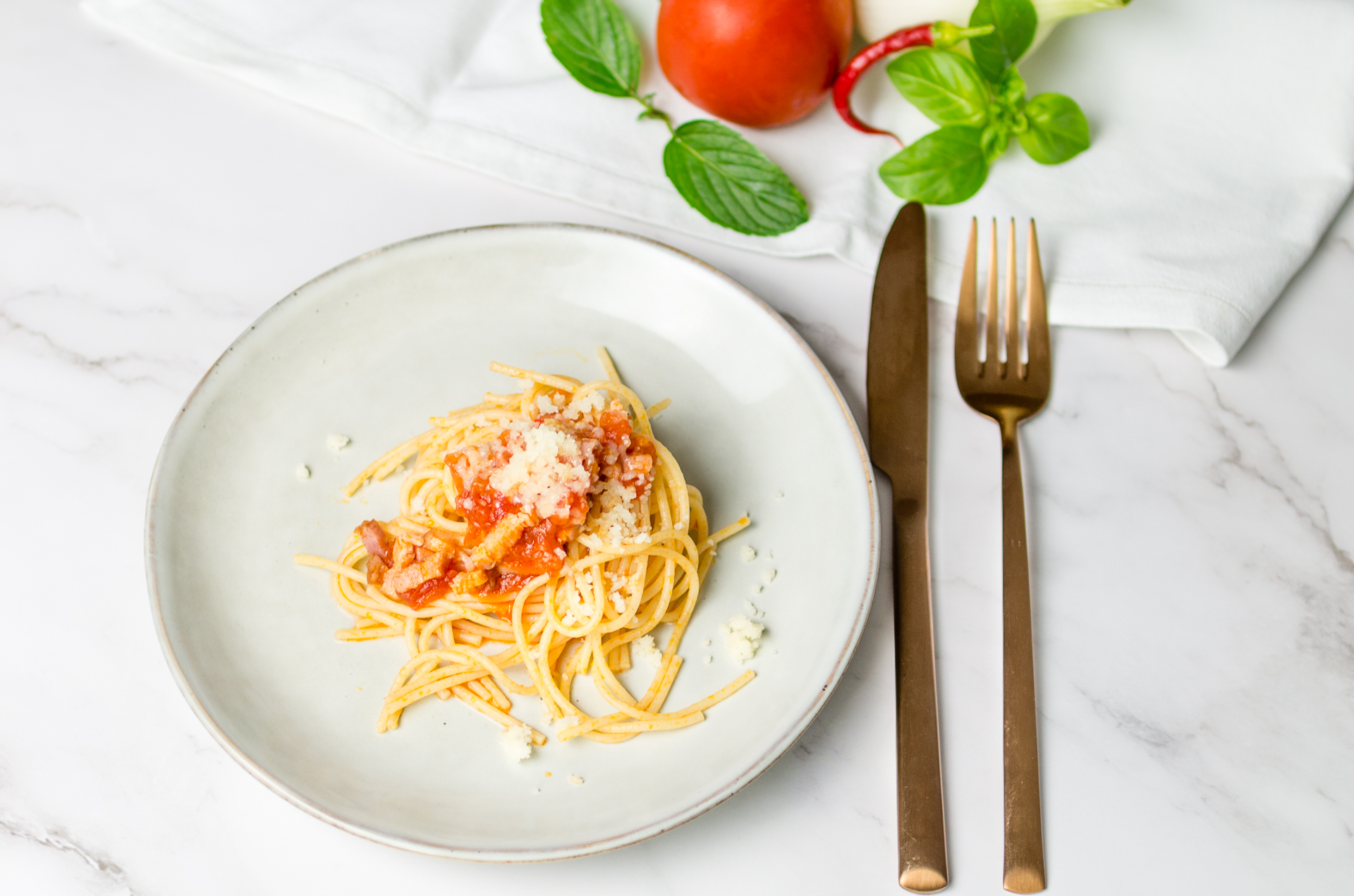 Con los espaguetis a la amatriciana tienes una receta genial que, además, puedes variar sustituyendo el beicon por otro ingrediente a tu gusto: gambas, salmón, lomo, tofu, etc. O, también puedes hacer los espaguetis de calabacín. Pero pruébalo tal cual te pongo en la receta porque están deliciosos.